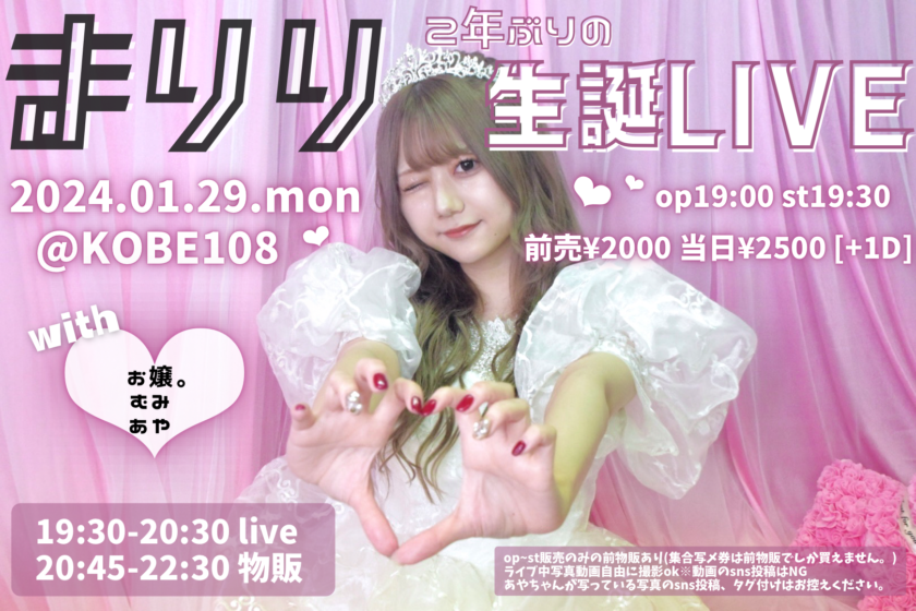 まりり 2年ぶりの生誕LIVE 1月 29 Mon 2024 live まりり 2年ぶりの生誕LIVE OPEN/START 19:00/19:30 ADV ¥2,000 /DOOR ¥2,500 (1D¥300別) まりり with お嬢。・むみ・あや 前のスケジュール 次のスケジュール