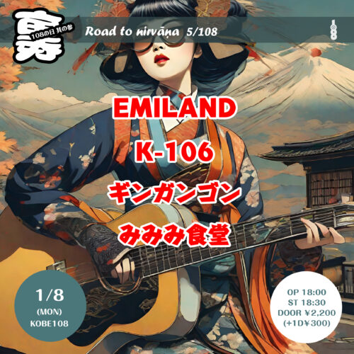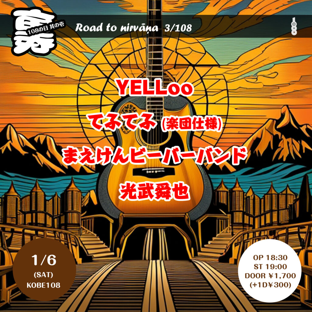 裏108の日其の壱~Road to nirvāṇa 3/108 1月 6 Sat 2024 live 裏108の日其の壱~Road to nirvāṇa 3/108 OPEN/START 18:30/19:00 DOOR ¥1,700 (1D¥300別) YELLoo てふてふ(楽団仕様) まえけんビーバーバンド 光武舜也 前のスケジュール 次のスケジュール