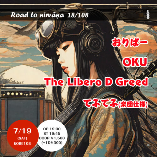 Road to nirvāṇa 18/108 7月 19 Sat 2025 live Road to nirvāṇa 18/108 OPEN/START 19:30/19:45 DOOR ¥1,500 (1D¥300別) おりばー OKU The Libero D Greed てふてふ(楽団仕様) 前のスケジュール 次のスケジュール