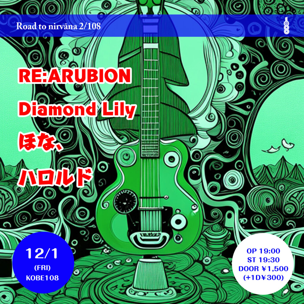 Road to nirvāṇa 2/108 12月 1 Fri 2023 live Road to nirvāṇa 2/108 OPEN/START 19:00/19:30 DOOR ¥1,500 (1D¥300別) Re:ARUBION Diamond Lily ほな、 ハロルド 前のスケジュール 次のスケジュール