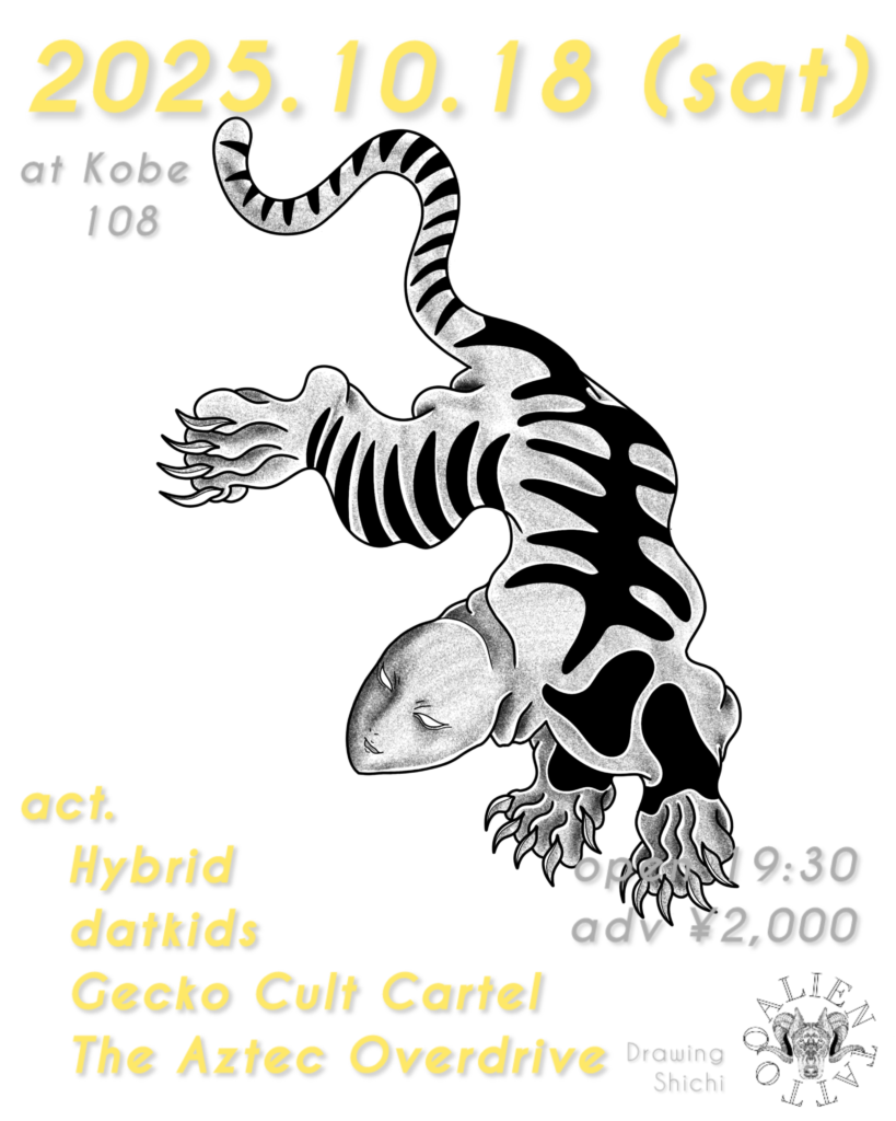 Road to nirvāṇa × Reptiroogs 10月 18 Sat 2025 live Road to nirvāṇa × Reptiroogs OPEN/START 19:30/19:45 DOOR¥2,000 (1D¥300別) datkids Hybrid Gecko Cult Cartel The Aztec Overdrive 前のスケジュール 次のスケジュール
