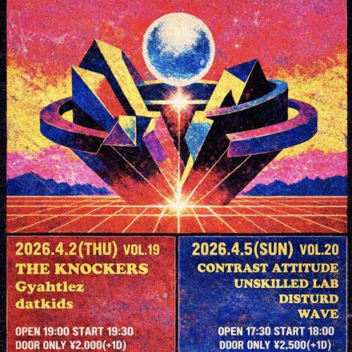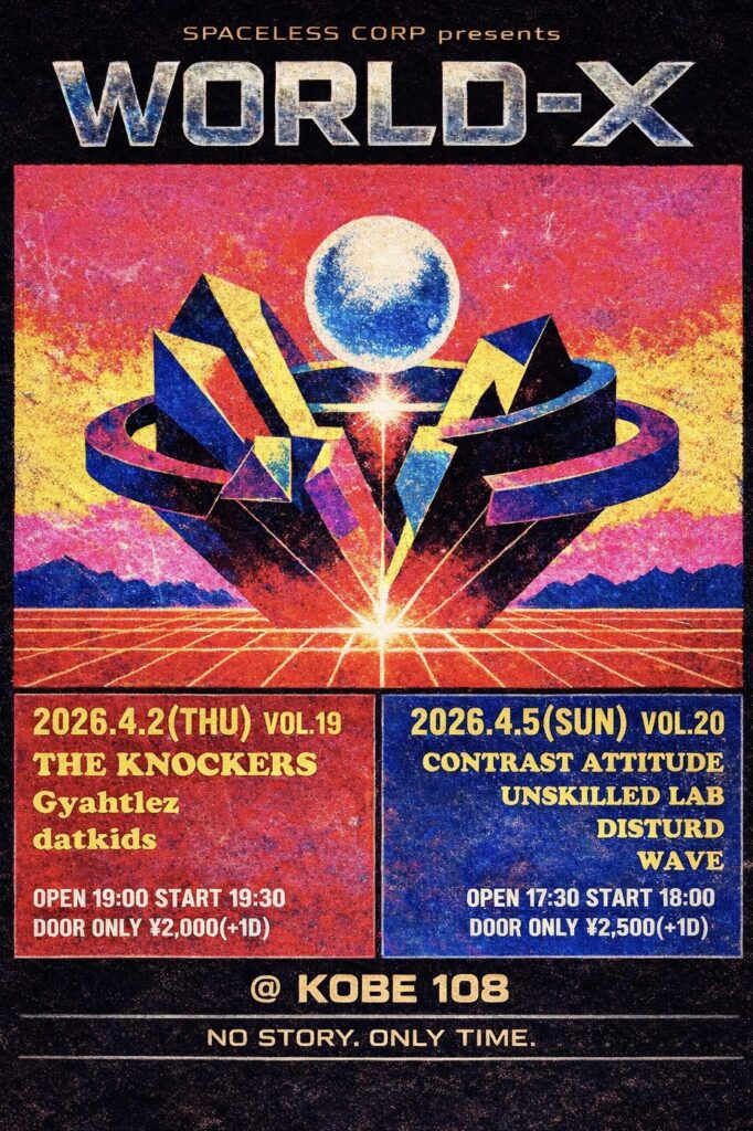 WORLD-X vol.19 4月 2 Thu 2026 live SPACELESS CORP presents 【WORLD-X vol.19】 OPEN/START 19:00/19:30 DOOR ONLY¥2,000 (1D¥300別) THE KNOCKERS Gyahtlez datkids 前のスケジュール 次のスケジュール