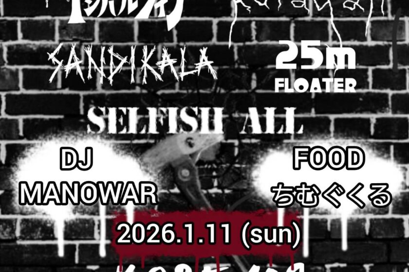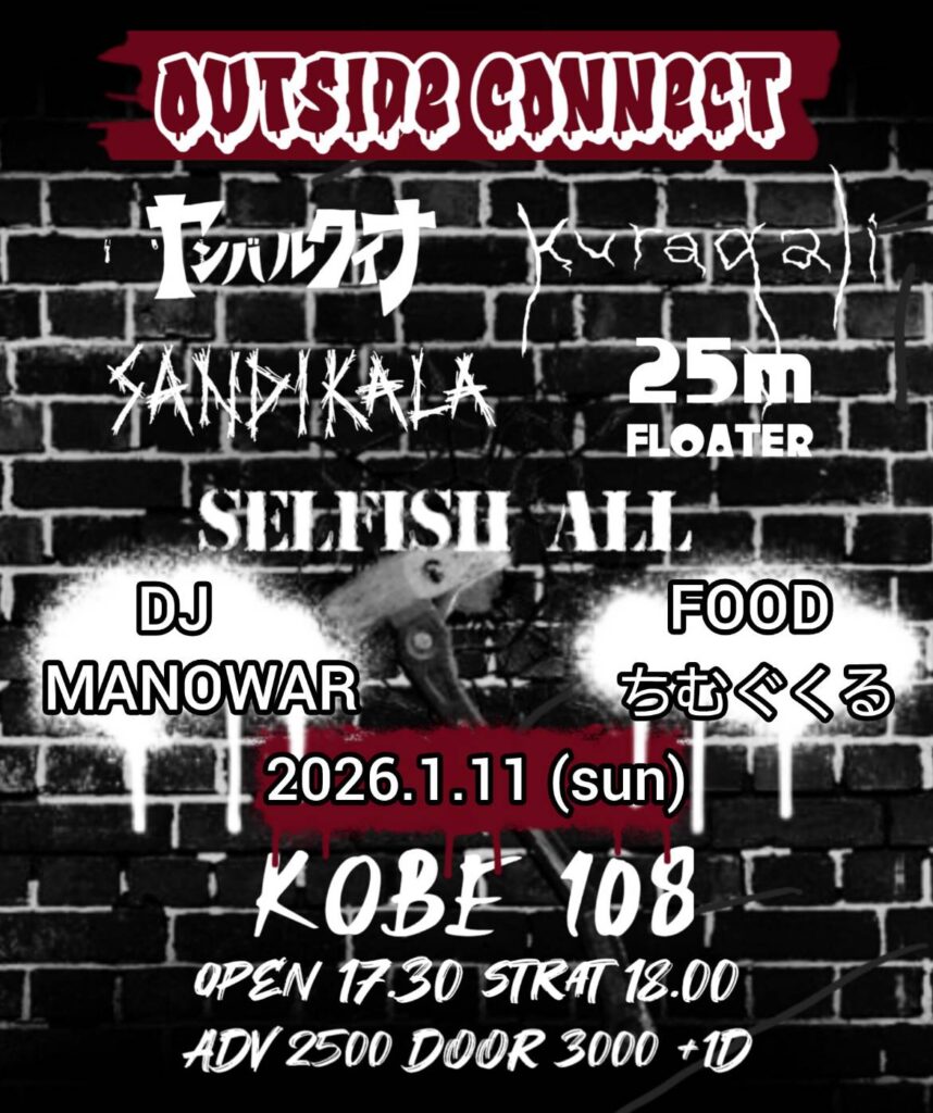 OUTSIDE CONNECT 1月 11 Sun 2026 live OUTSIDE CONNECT OPEN/START 17:30/18:00 ADV ¥2,500 / DOOR ¥3,000 (1D¥300別) SANDIKARA 25M FLOATER SELFISH ALL kuragari ヤンバルクイナ DJ: MANOWAR / FOOD: ちむぐくる 前のスケジュール 次のスケジュール