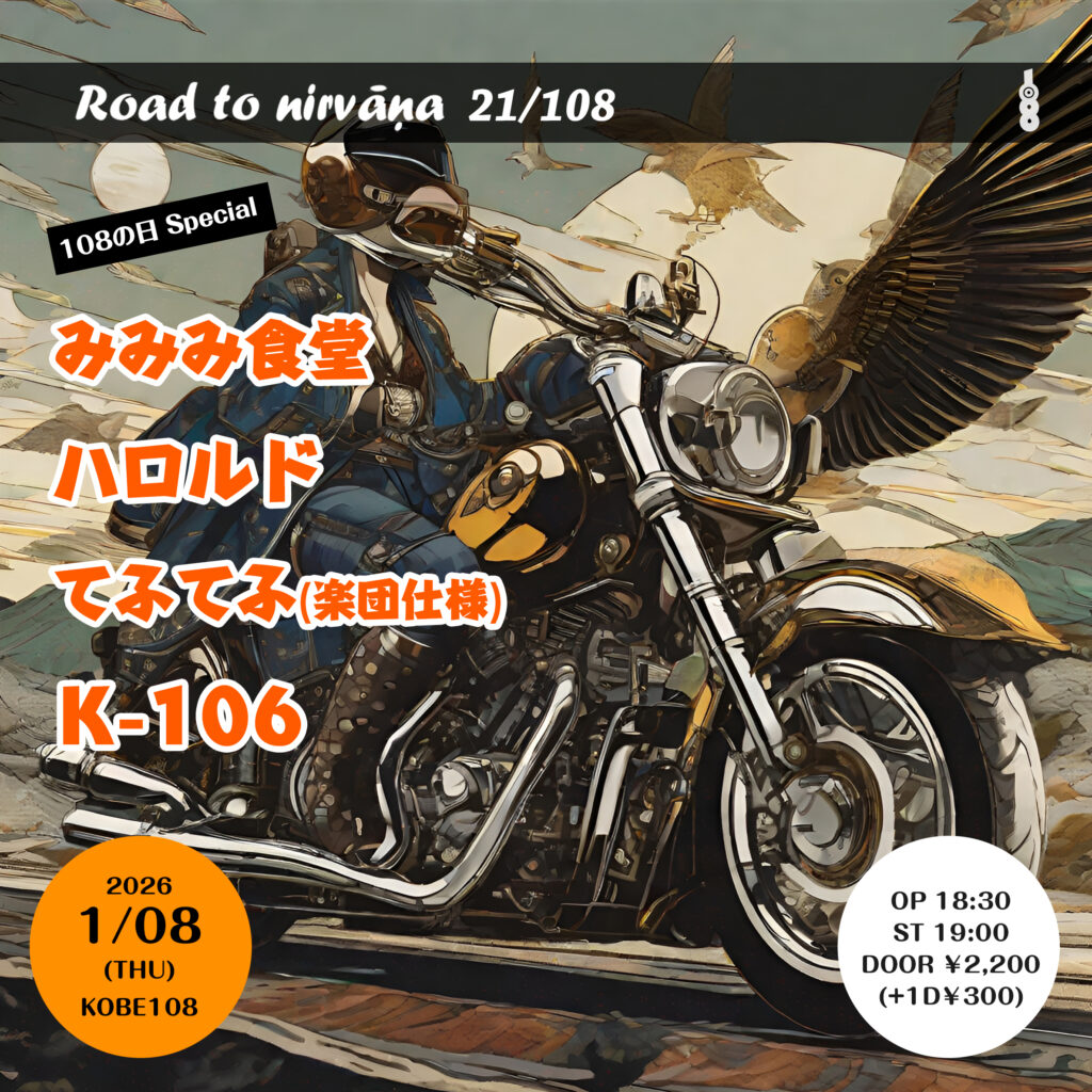 Road to nirvāṇa 21/108 1月 8 Thu 2026 live Road to nirvāṇa 21/108 OPEN/START 18:30/19:00 DOOR ¥2,200 (1D¥300別) みみみ食堂 ハロルド てふてふ(楽団仕様) K-106 前のスケジュール 次のスケジュール